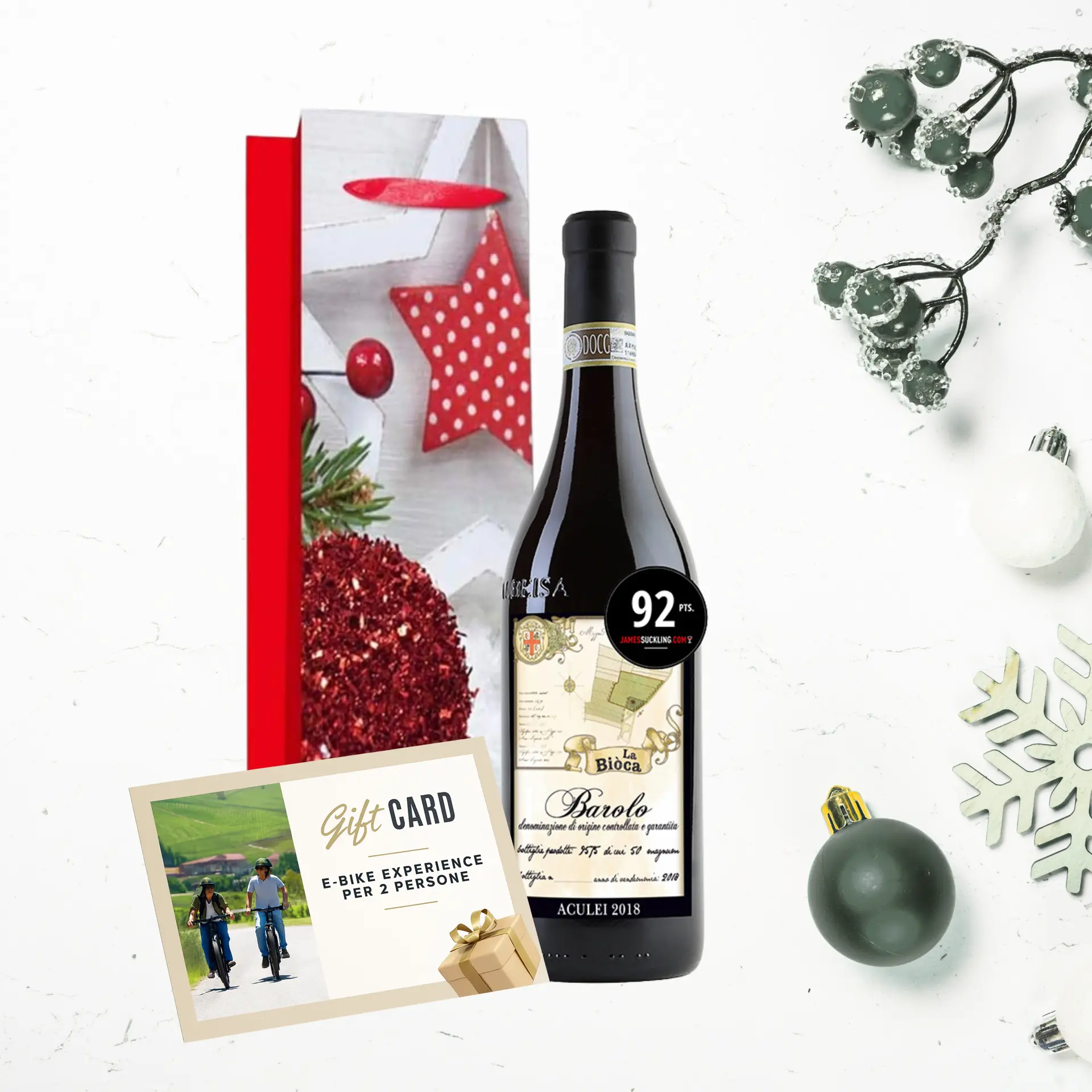 Una giftbox d’eccellenza con Barolo “Aculei” DOCG, simbolo delle Langhe, e un giro in e-bike per due persone. Per chi vuole regalare un’esperienza di gusto e territorio davvero speciale. Spedizione gratuita e voucher valido 24 mesi.